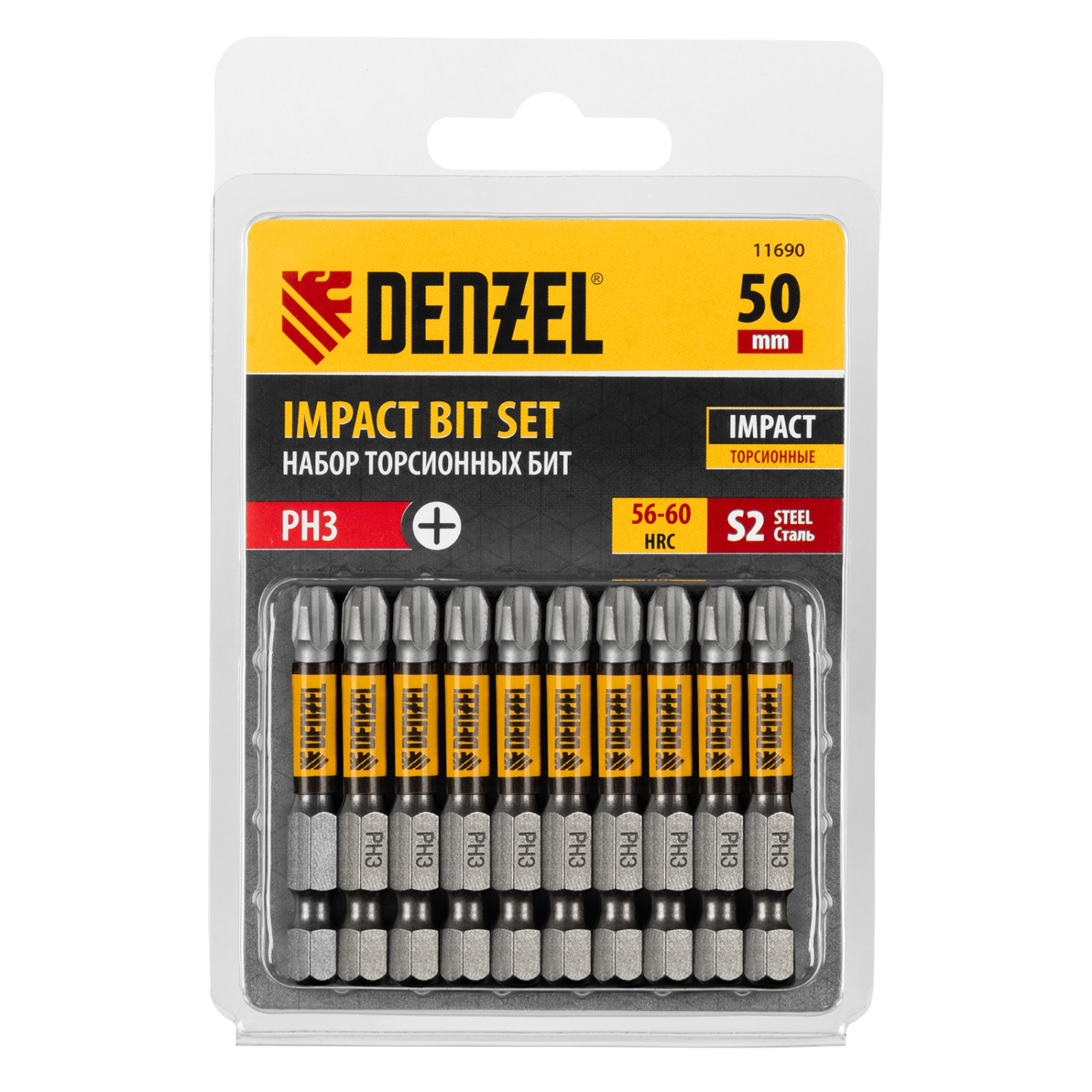 Набор бит торсионных PH3 x 50 мм Denzel 11690 с лазерной обработкой шлица, из стали S2, 10 шт., предназначен для монтажа и демонтажа резьбовых соединений с помощью ударного шуруповерта. Он незаменим в строительных, слесарных и монтажных работах, в автосервисах, при проведении ремонта в доме.Торсионная зона способна пружинить, за счет чего она частично амортизирует тангенциальный удар от шуруповерта. Такое решение позволяет равномерно распределить нагрузку по бите, избежать поломки шлица и в разы увеличить объем работы, проделанный одной насадкой. Продуманная конструкция — торсионная зона позволяет работать ударным шуруповертом даже с особо твердыми поверхностями без риска поломки бит.