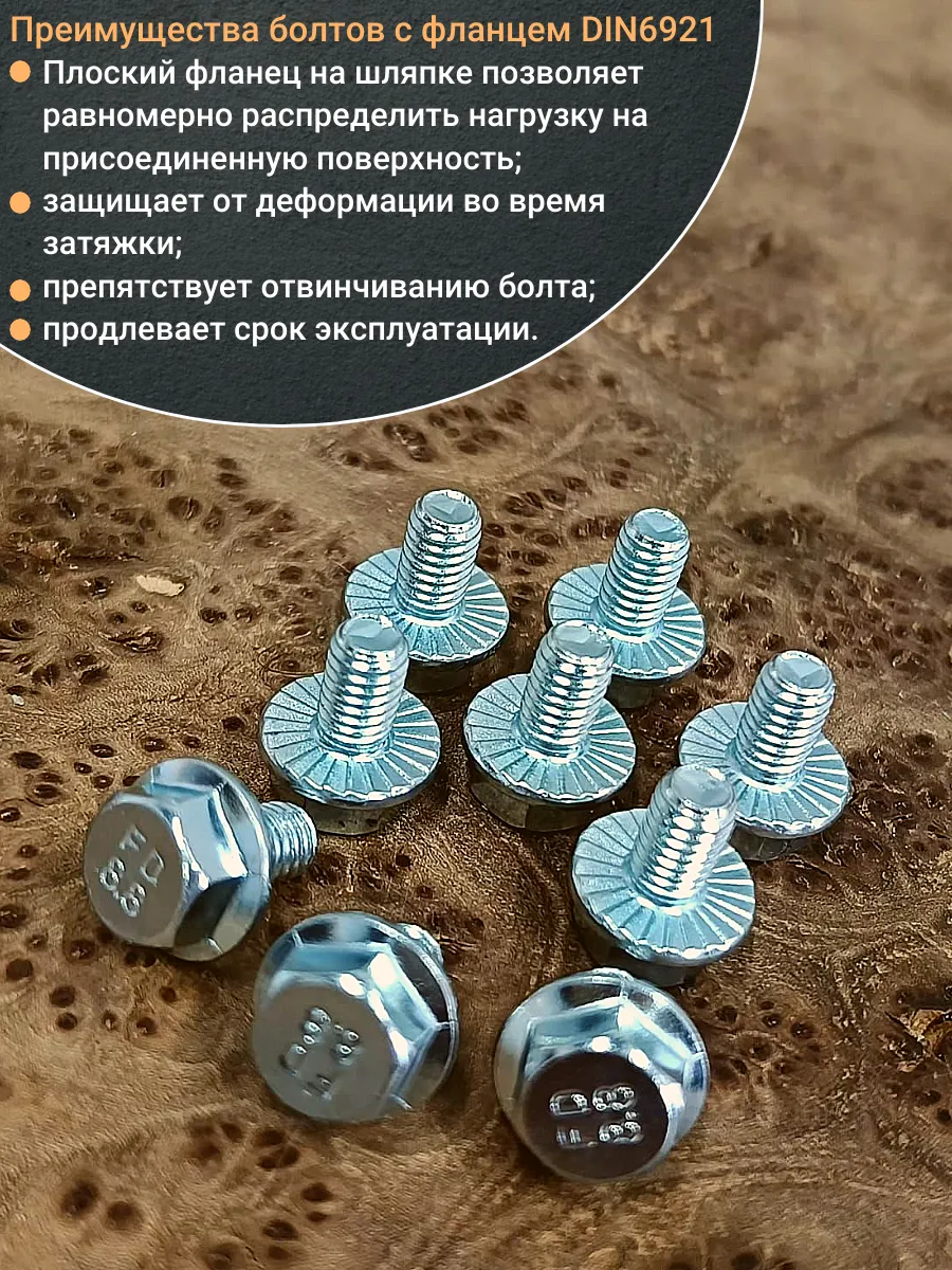 Болт с шестигранной головкой и фланцем используют как крепление различных деталей или конструкций. Данный болт используют только вместе с шайбой или гайкой. Болт DIN 6921 изготавливают из оцинкованной стали. Модель имеет как резьбу на 4/5 длине стержня, так и полную резьбу, а так же плоский фланец и шестигранную головку. Данная модель пользуется популярностью на строительно-монтажных площадках, установка болта не требует использование отдельной шайбы