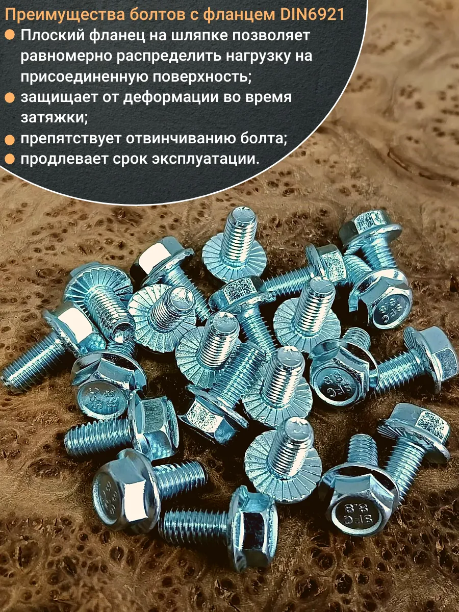 Болт с шестигранной головкой и фланцем используют как крепление различных деталей или конструкций. Данный болт используют только вместе с шайбой или гайкой. Болт DIN 6921 изготавливают из оцинкованной стали. Модель имеет как резьбу на 4/5 длине стержня, так и полную резьбу, а так же плоский фланец и шестигранную головку. Данная модель пользуется популярностью на строительно-монтажных площадках, установка болта не требует использование отдельной шайбы.
