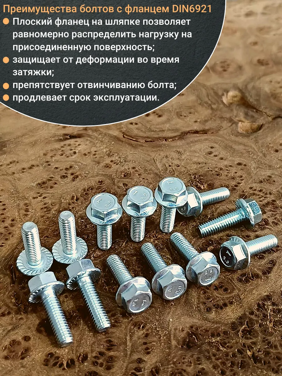 Болт с шестигранной головкой и фланцем используют как крепление различных деталей или конструкций. Данный болт используют только вместе с шайбой или гайкой. Болт DIN 6921 изготавливают из оцинкованной стали. Модель имеет как резьбу на 4/5 длине стержня, так и полную резьбу, а так же плоский фланец и шестигранную головку. Данная модель пользуется популярностью на строительно-монтажных площадках, установка болта не требует использование отдельной шайбы
