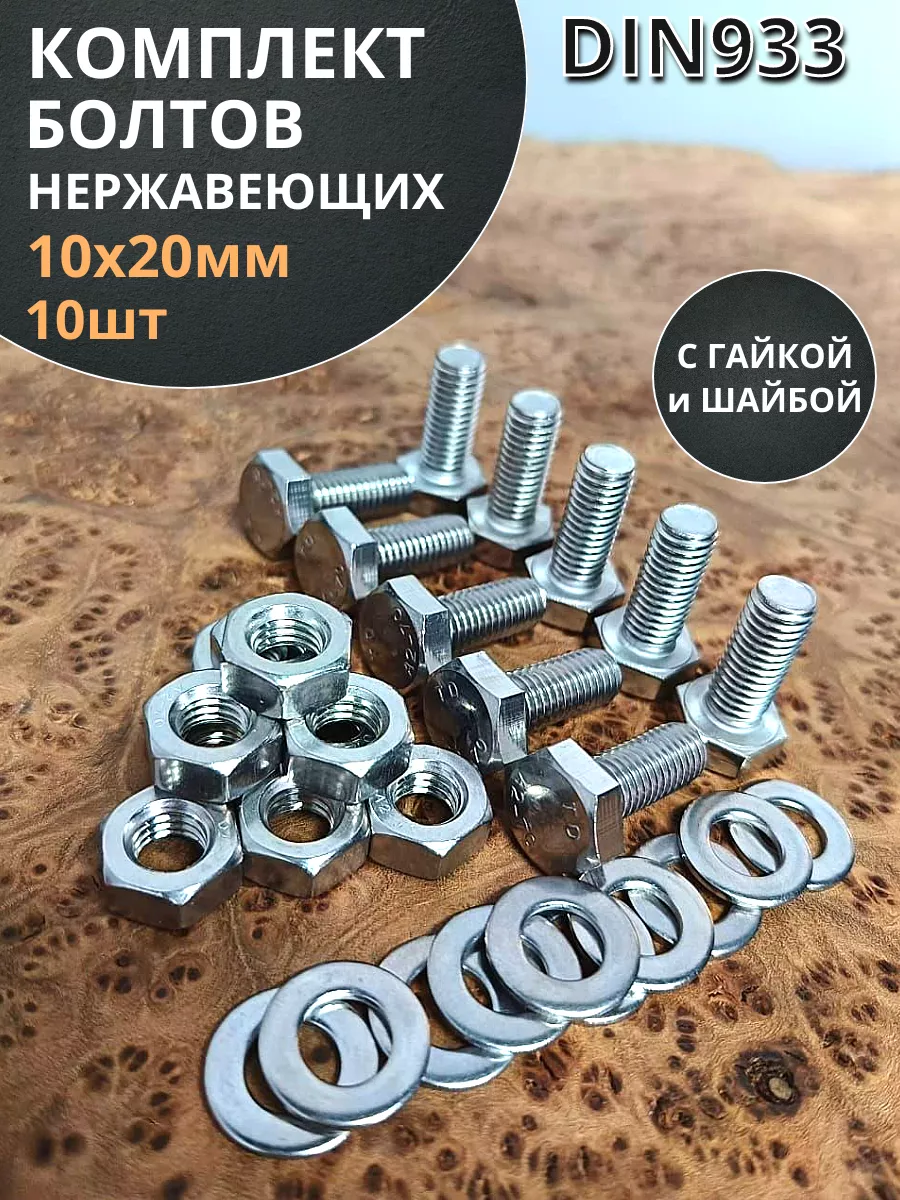 Болт нержавеющий 10х20 мм DIN933 с гайкой и шайбой