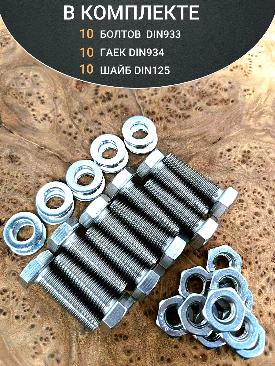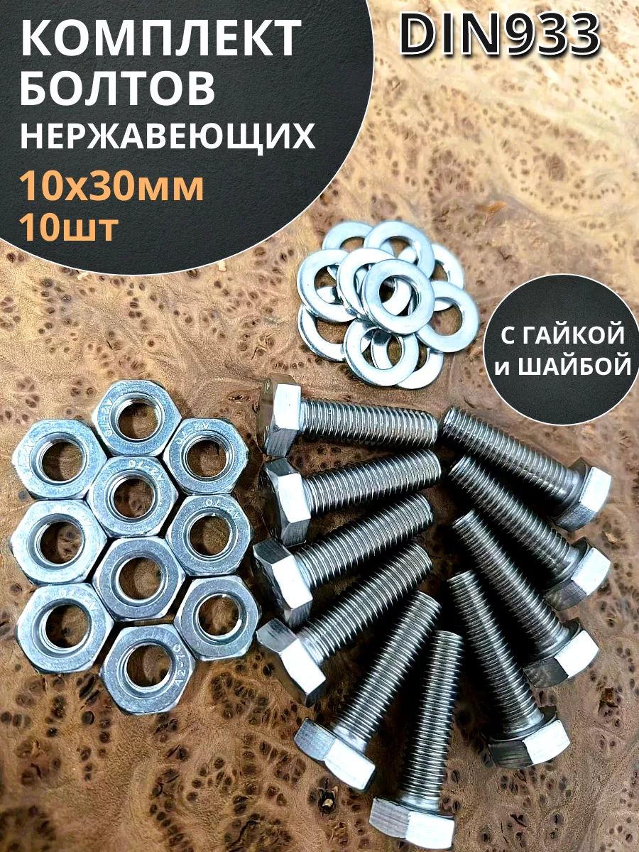 Болт нержавеющий 10х30 мм DIN933 с гайкой и шайбой, 10шт