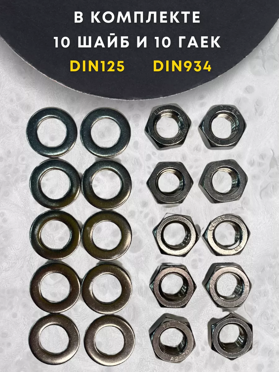 Болт нержавеющий 12х50 DIN933 с гайкой и шайбой, 10 шт.