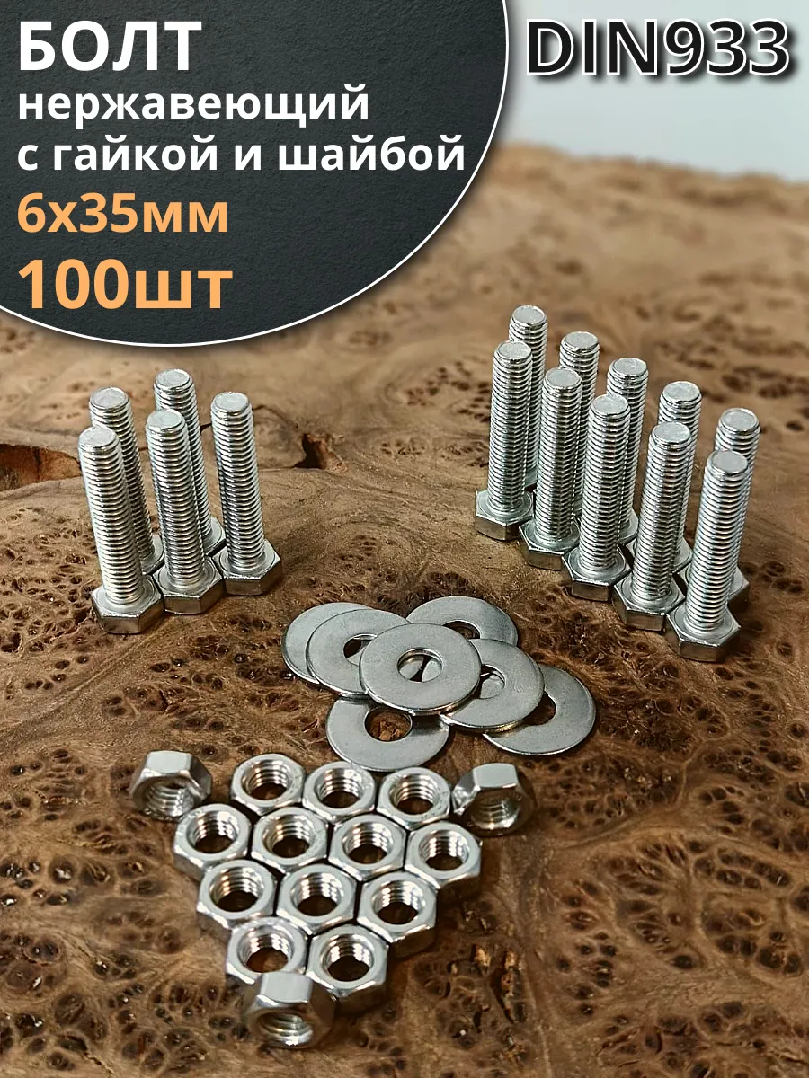 | Болт нержавеющий 6х35 мм DIN933 с гайкой и шайбой, 100шт. | 33373 | 1 шт. |