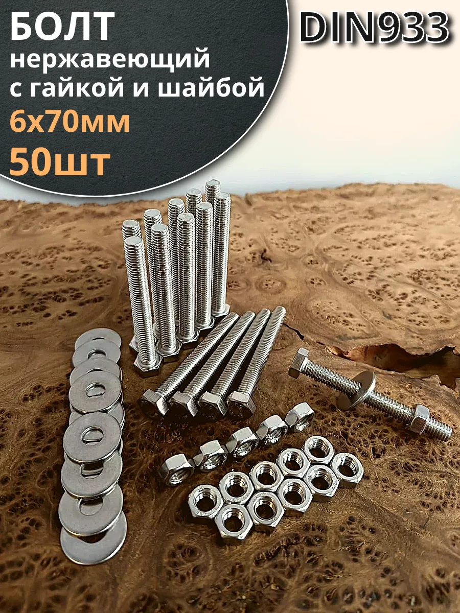 | Болт нержавеющий 6х70 мм DIN933 с гайкой и шайбой, 50шт. | 33380 | 1 шт. |