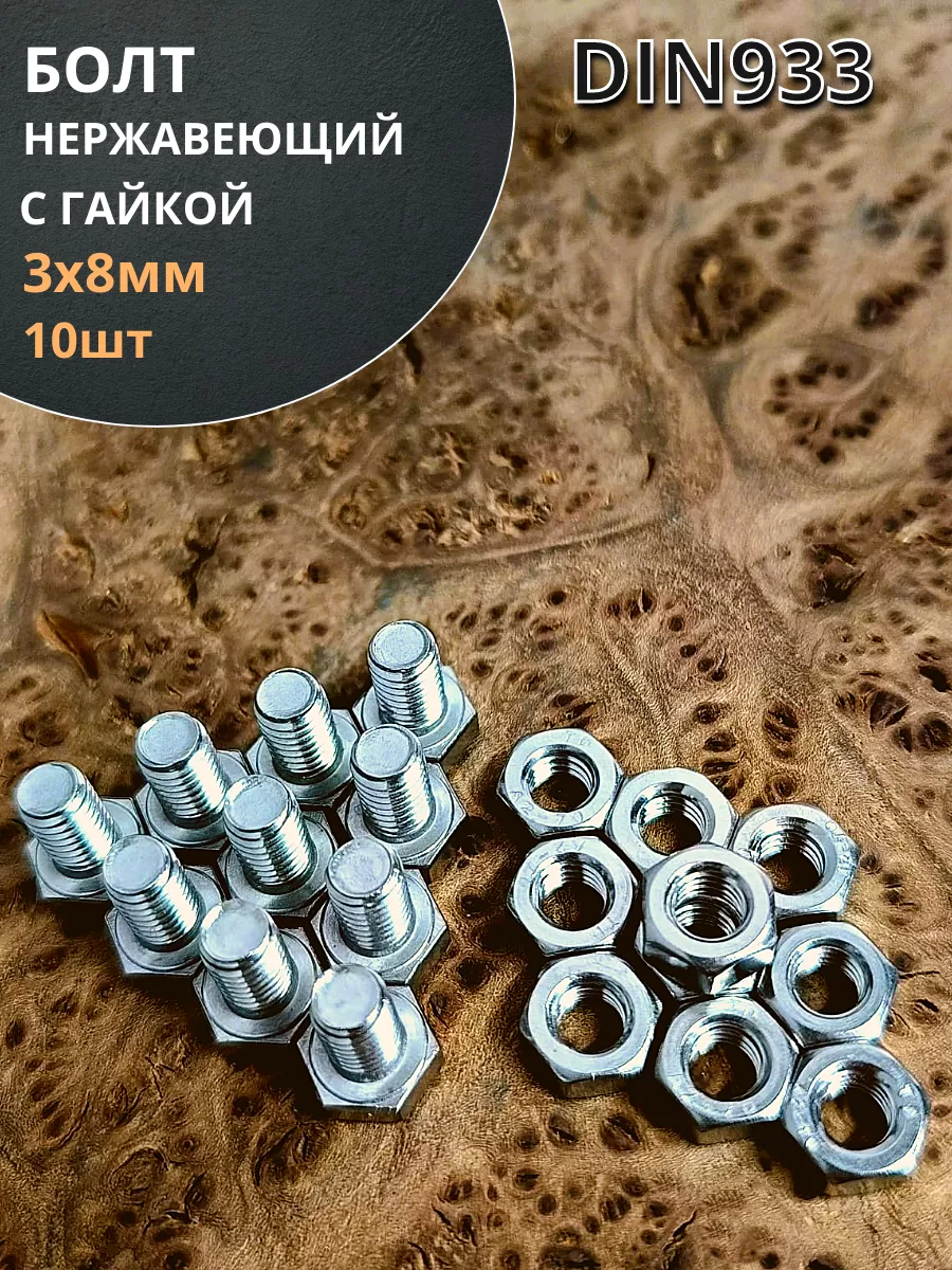 Болт нержавеющий М3х8 мм DIN 933 с гайкой , 10 шт.