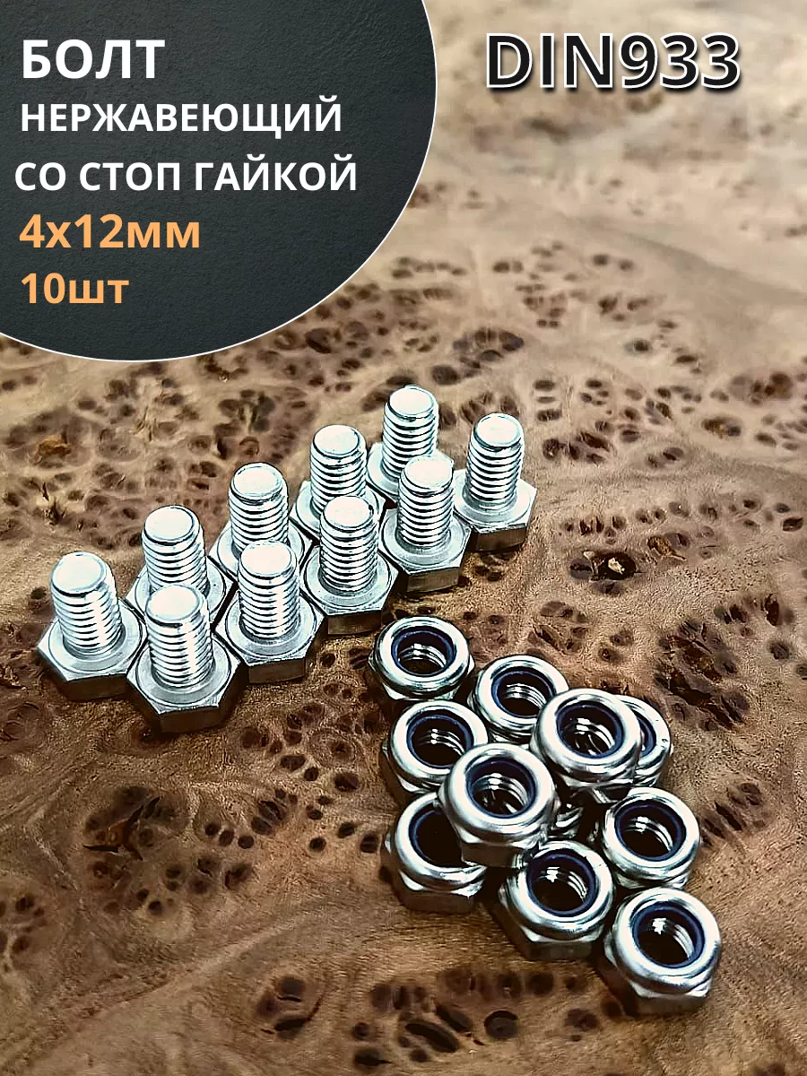 Болт нержавеющий М4х12 мм DIN 933 с гайкой , 10 шт.