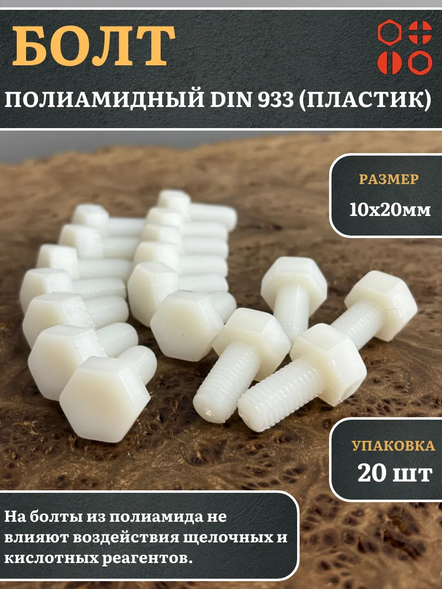 Болт полиамидный 10х20 мм DIN 933 (пластик), 20 шт.