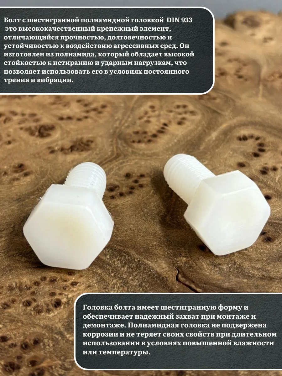 | Болт полиамидный 10х30 мм DIN 933 (пластик), 50 шт. | бп1030933ф50 | 1 шт. |