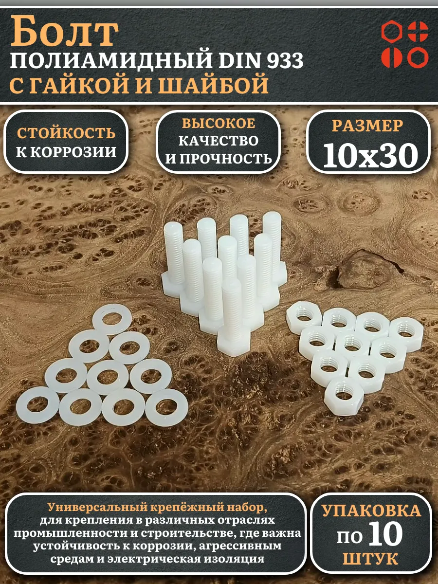 Болт полиамидный 10х30 мм DIN 933 с гайкой и шайбой, по 10 шт.