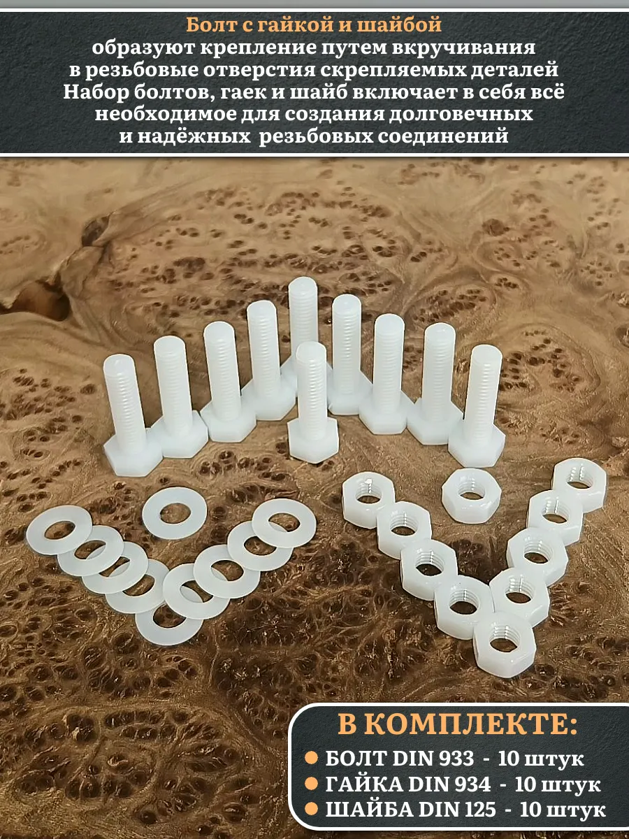 | Болт полиамидный 10х30 мм DIN 933 с гайкой и шайбой, по 20 шт. | бп1030933наборГШф20 | 1 шт. |