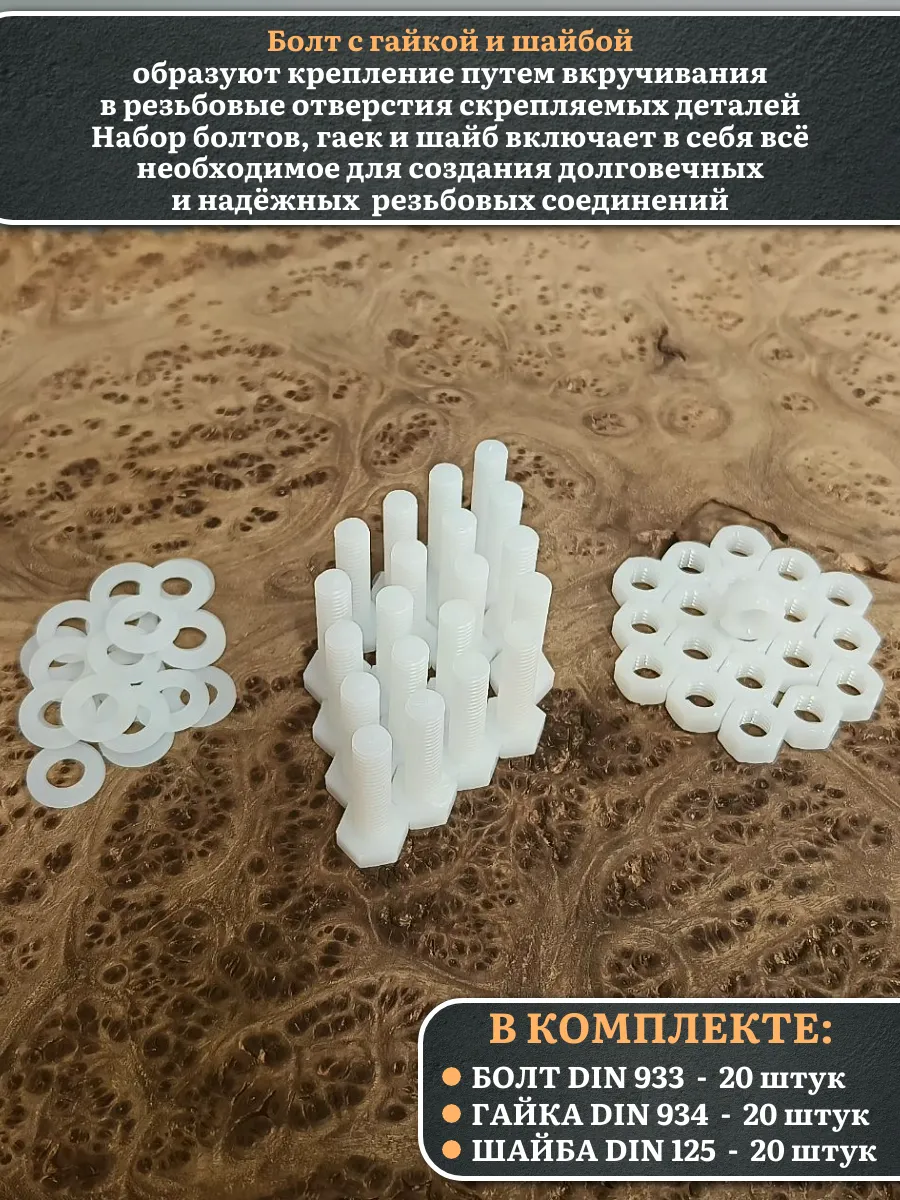 Болт полиамидный 10х30 мм DIN 933 с гайкой и шайбой, по 20 шт.