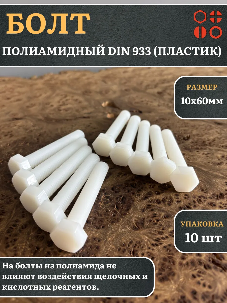 | Болт полиамидный 10х60 мм DIN 933 (пластик), 50 шт. | бп1060933ф50 | 1 шт. |