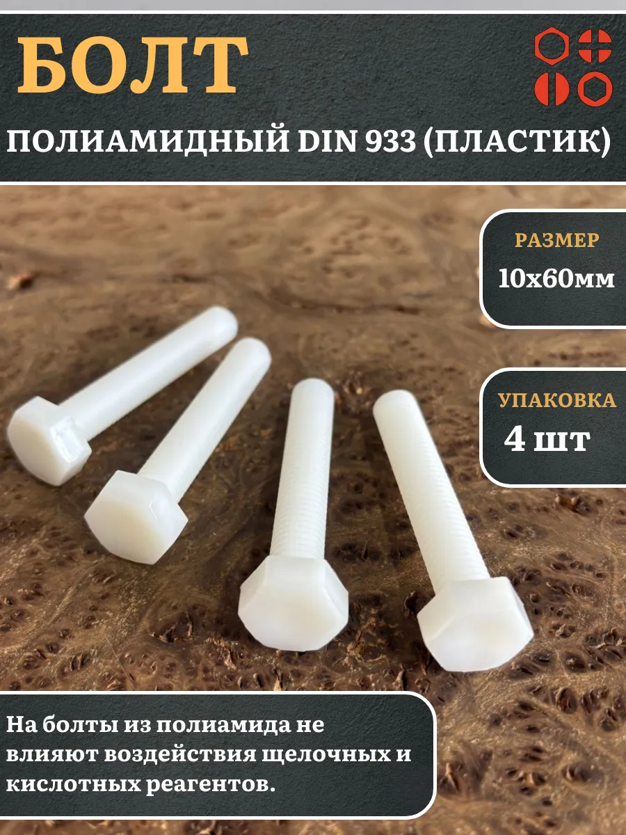Болт полиамидный 10х60 мм DIN 933 (пластик), 4 шт.