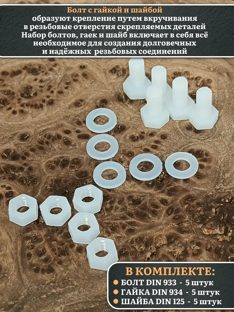 Болт полиамидный 5х10 мм DIN 933 с гайкой и шайбой, по 5 шт.