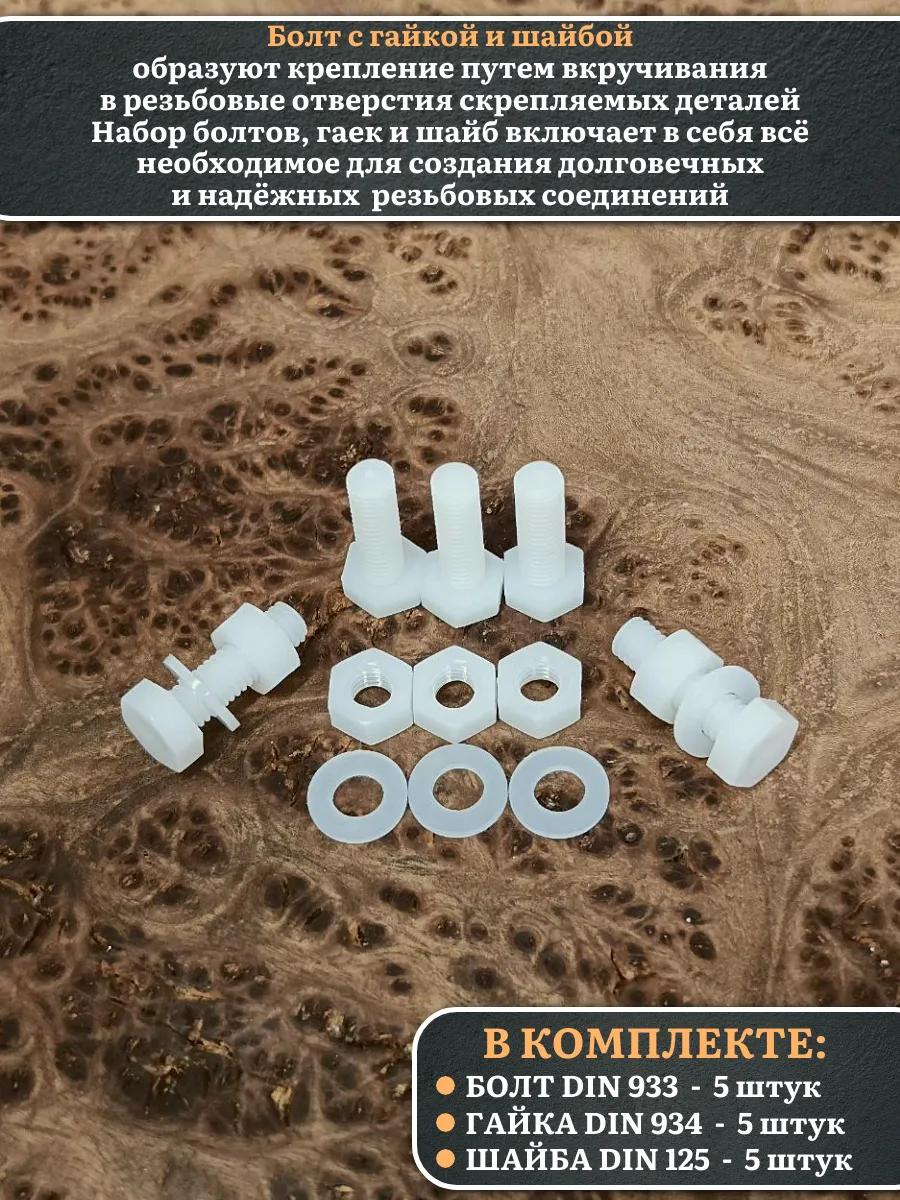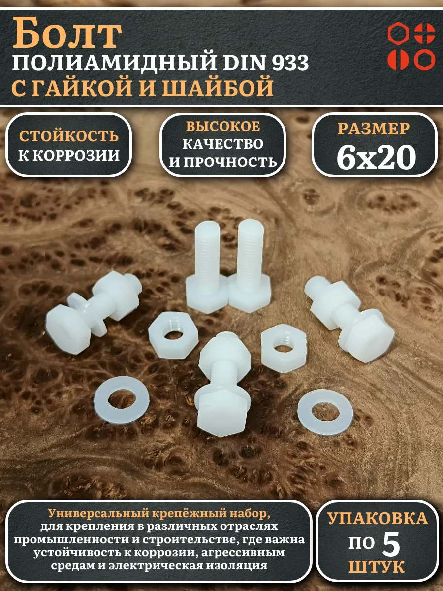 Болт полиамидный 6х20 мм DIN 933 с гайкой и шайбой, по 5 шт.