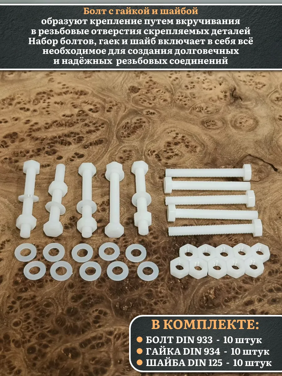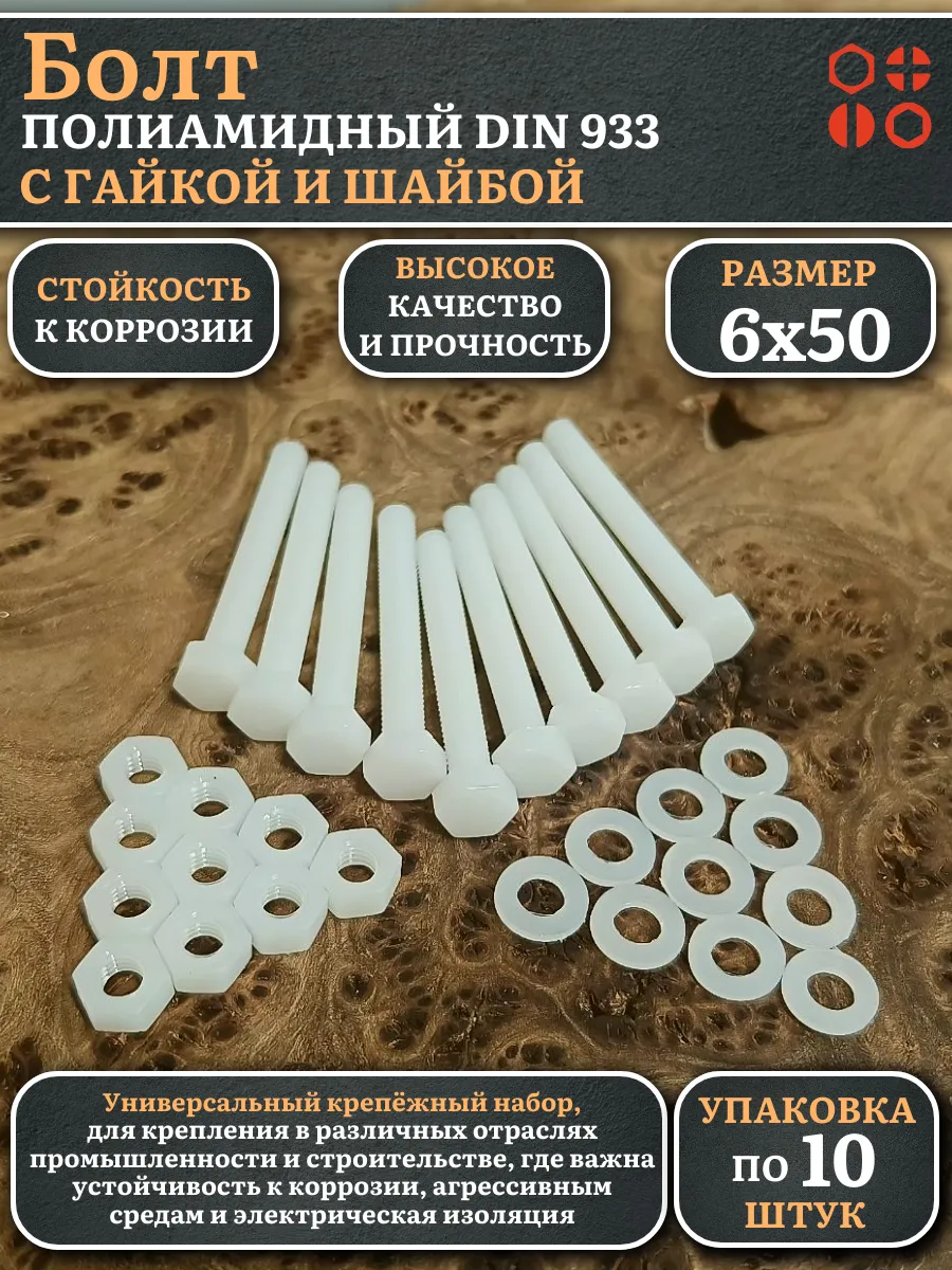 | Болт полиамидный 6х50 мм DIN 933 с гайкой и шайбой, по 20 шт. | бп650933наборГШф20 | 1 шт. |