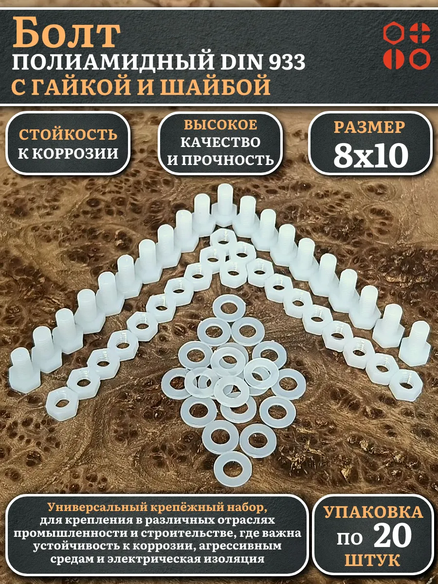 Болт полиамидный 8х10 мм DIN 933 с гайкой и шайбой, по 20 шт.