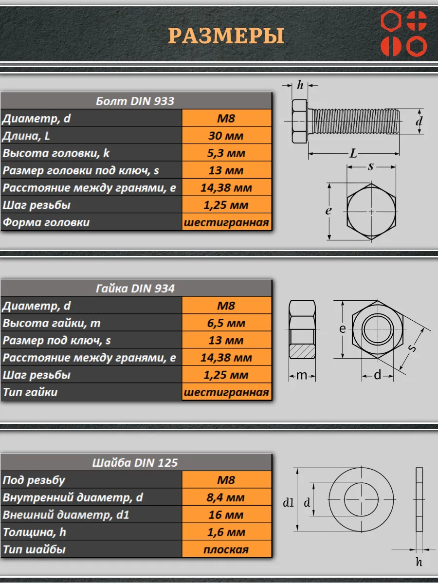 | Болт полиамидный 8х30 мм DIN 933 с гайкой и шайбой, по 10 шт. | бп830933наборГШф10 | 1 шт. |