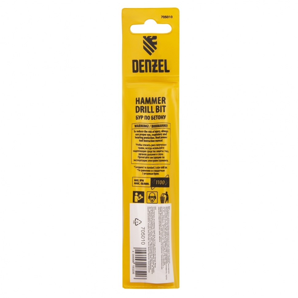 Бур по бетону Denzel арт. 705010 с хвостовиком SDS PLUS и двойной спиралью предназначен для сверления бетона, кирпича и камня. Он используется в качестве оснастки для перфораторов с патроном SDS Plus. Бур оптимален для проведения строительных, ремонтных, монтажных работ. Преимущества Продуманная конструкция — режущая твердосплавная пластина из стали ВК8 80-90 HRC с W-образной заточкой имеет высокий ресурс и способна сверлить отверстия до 30% быстрее, в том числе при работе с камнем. Прочность и износостойкость — рабочая часть из легированной стали 40Х выдерживает интенсивные и длительные ударные нагрузки, а также делает бур самым высокопроизводительным среди аналогов средней цены. Двойная спираль и канавка с дополнительным желобом — за счет более эффективного отвода шлама рабочая часть не перегревается, такая разработка позволяет продлить срок службы бура. Высокая технологичность — буры Denzel изготавливаются на производстве MAKITA, что гарантирует их качество и эффективность сверления. Бур поставляется в у