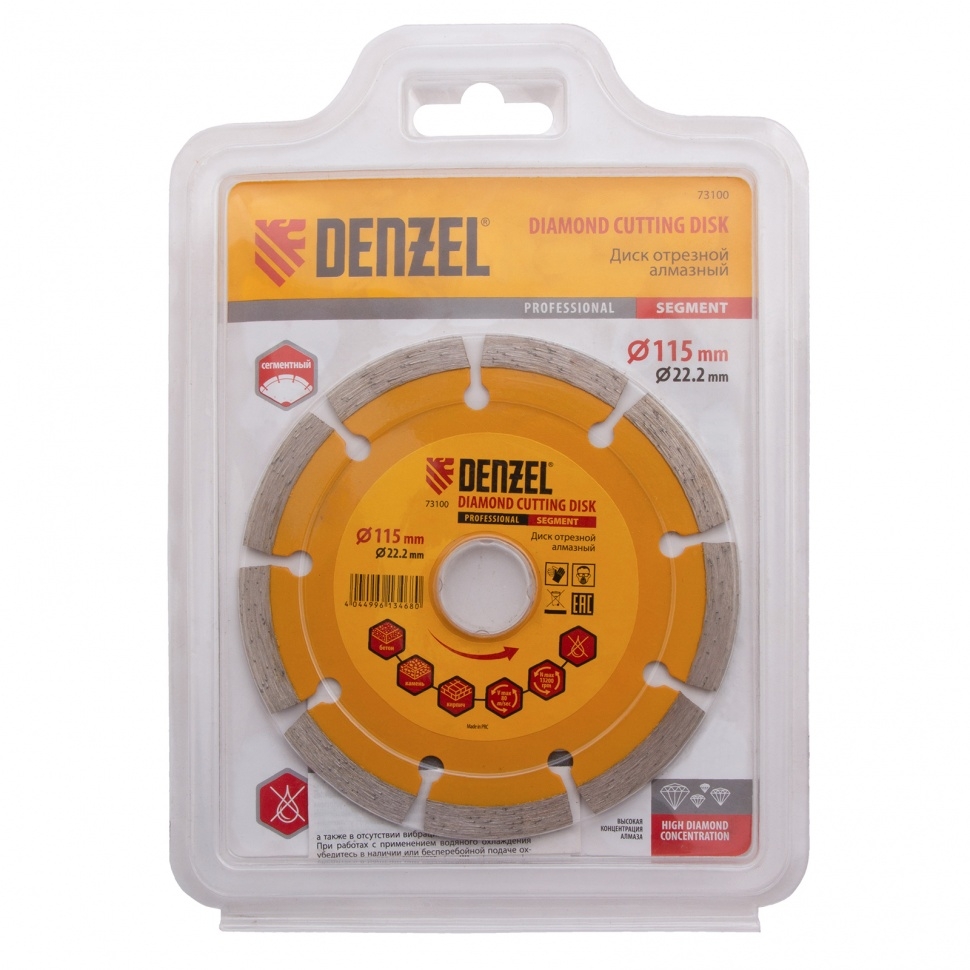 Отрезной алмазный диск Denzel Сегментный ф115 х 22,2 мм 73100 используется для сухого резания по свежему и старому бетону, камню, кирпичу, шлакоблоку, мрамору, тротуарной плитке. Он применяется в качестве сменного инструмента с профессиональными и бытовыми УШМ. Диск сегментного типа отличается высокой производительностью даже при интенсивных нагрузках, не требует водяного охлаждения.Преимущества Эффективность реза плотных материалов обеспечивает сбалансированная металлическая связка, устойчивая к перегреву и перегрузкам. Рабочая часть с высококонцентрированным алмазным слоем шириной 7 мм повышает скорость реза и износостойкость диска. Диск разделен на сегменты, что способствует хорошему отводу пыли во время работы. Изготовление по технологии холодного прессования позволяет добиться хороших режущих свойств диска.