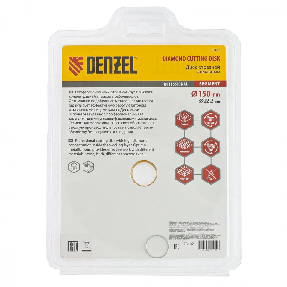 Отрезной алмазный диск Denzel Сегментный ф150 х 22,2 мм 73102 используется для сухого резания по свежему и старому бетону, камню, кирпичу, шлакоблоку, мрамору, тротуарной плитке. Он применяется в качестве сменного инструмента с профессиональными и бытовыми УШМ. Диск сегментного типа отличается высокой производительностью даже при интенсивных нагрузках, не требует водяного охлаждения.Преимущества Эффективность реза плотных материалов обеспечивает сбалансированная металлическая связка, устойчивая к перегреву и перегрузкам. Рабочая часть с высококонцентрированным алмазным слоем шириной 7 мм повышает скорость реза и износостойкость диска. Диск разделен на сегменты, что способствует хорошему отводу пыли во время работы. Изготовление по технологии холодного прессования позволяет добиться хороших режущих свойств диска.