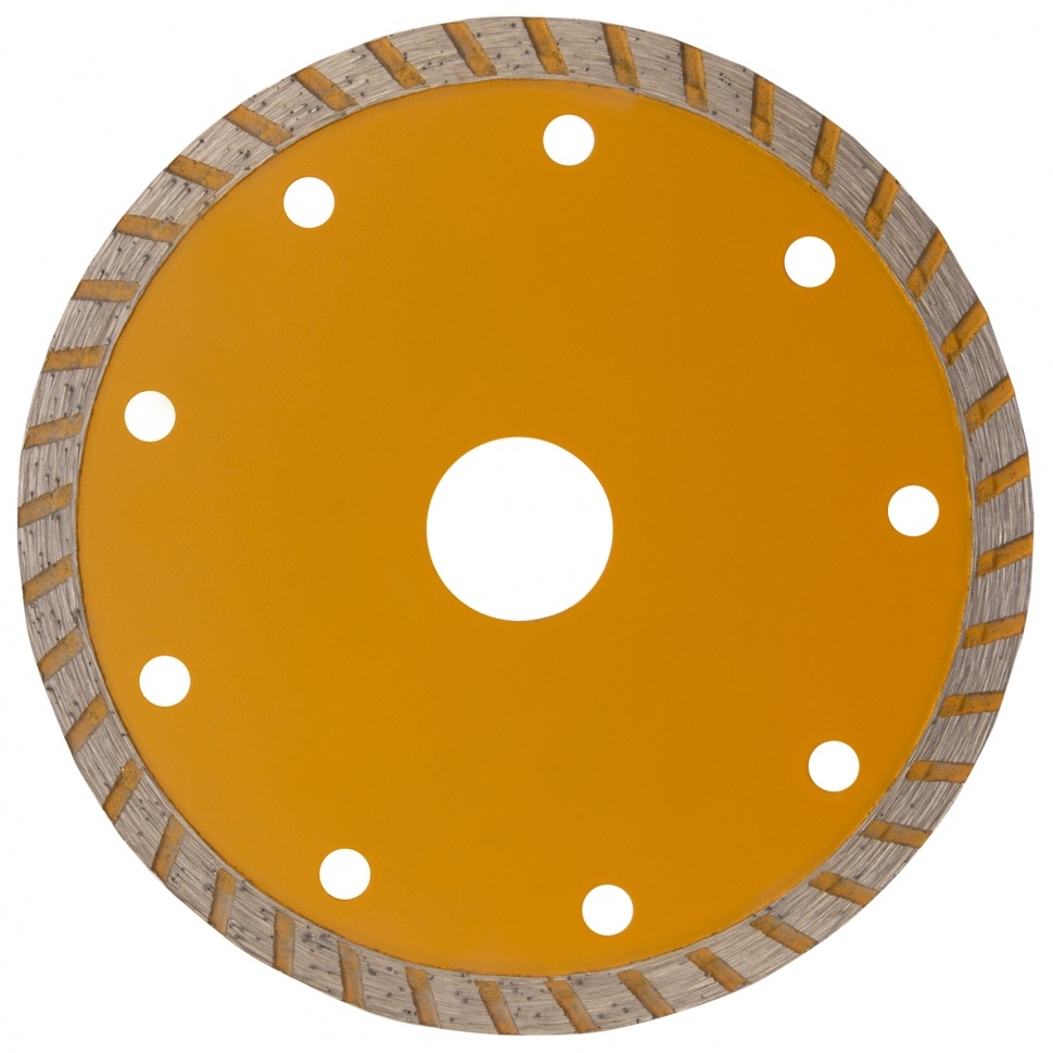 Отрезной алмазный диск Denzel Турбо ф125 х 22,2 мм 73108 рассчитан на сухое резание камня, кирпича, свежего и затвердевшего бетона, железобетона. Он используется в качестве оснастки на УШМ с посадочным отверстием 22,2 мм при проведении бытовых и профессиональных отрезных работ. Турбо диск режет снижает ударную нагрузку при резании материалов и не требует водяного охлаждения.Преимущества Качественная металлическая связка обеспечивает эффективность работы с плотными материалами, т.к. устойчивая к высоким температурам. Режущий слой шириной 7 мм с высокой концентрацией алмазов позволяет увеличить скорость реза и износостойкость диска. Диск изготовлен по технологии холодного прессования, поэтому отличается хорошими режущими свойствами.