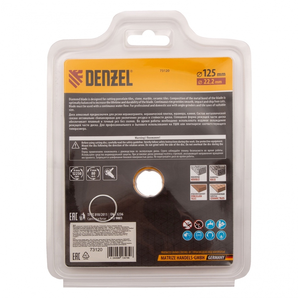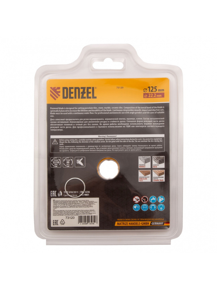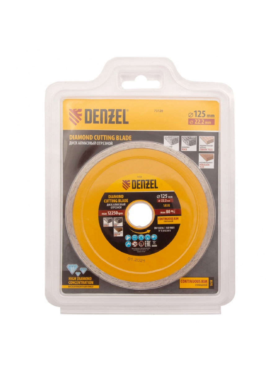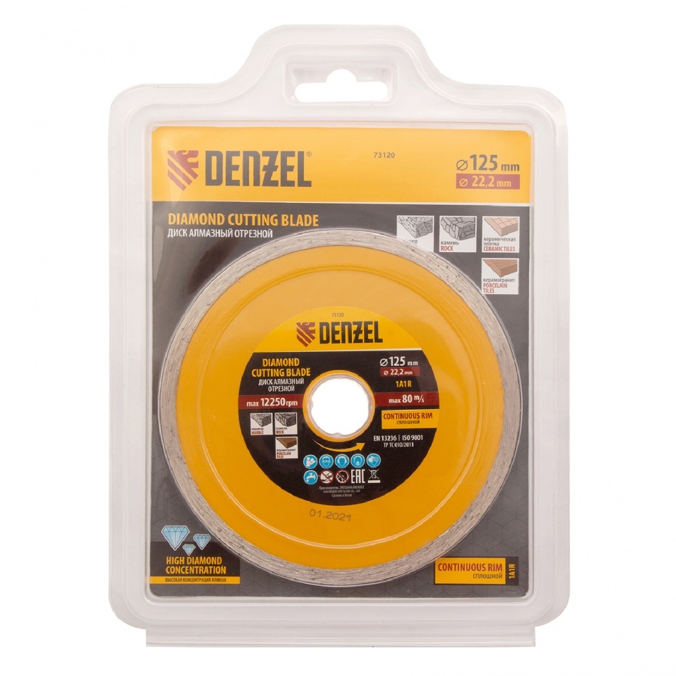 Отрезной алмазный диск Denzel Сплошной 73120, ф125 х 22,2 мм, используется для мокрого резания совместно с углошлифовальными машинами или плиткорезами с посадочным диаметром 22,2 мм. С его помощью режут камень, мрамор, керамогранитную и керамическую плитку. Диск отличается хорошей производительностью за счет высокой скорости реза, поэтому подходит для профессионального применения.Преимущества Сплошная конструкция обеспечивает эффективное выполнение большого объема работ даже при резании хрупких материалов. Режущая кромка шириной 7 мм позволяет получить аккуратный срез без зазубрин и сколов. Диск обладает высоким рабочим ресурсом благодаря увеличенной концентрации алмазов в рабочем слое. Отрезной диск изготовлен способом холодного прессования.