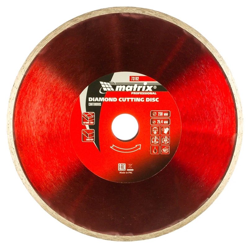 Диск алмазный отрезной сплошной Matrix 73192, 230 х 25,4 мм, предназначен для мокрого реза мрамора, керамической плитки, керамогранита, натурального или искусственного камня. Устанавливается на углошлифовальные машины и плиткорезы с посадочным диаметром 25,4 мм. Благодаря использованию водяного охлаждения улучшается качество реза, а также продлевается срок службы диска. Преимущества Благодаря сплошной кромке и использованию водяного охлаждения срез получается ровным, без сколов и трещин. За счет качественного исполнения методом холодного прессования диск долго сохраняет режущие свойства. Связка из металлических компонентов надежно удерживает алмазы, что обеспечивает высокий рабочий ресурс. Рабочий слой шириной 6 мм с высокой концентрацией алмазов гарантирует хорошую производительность диска.