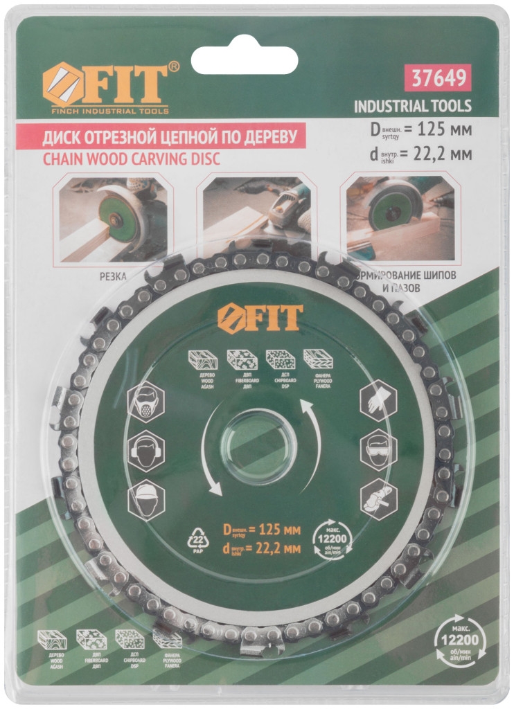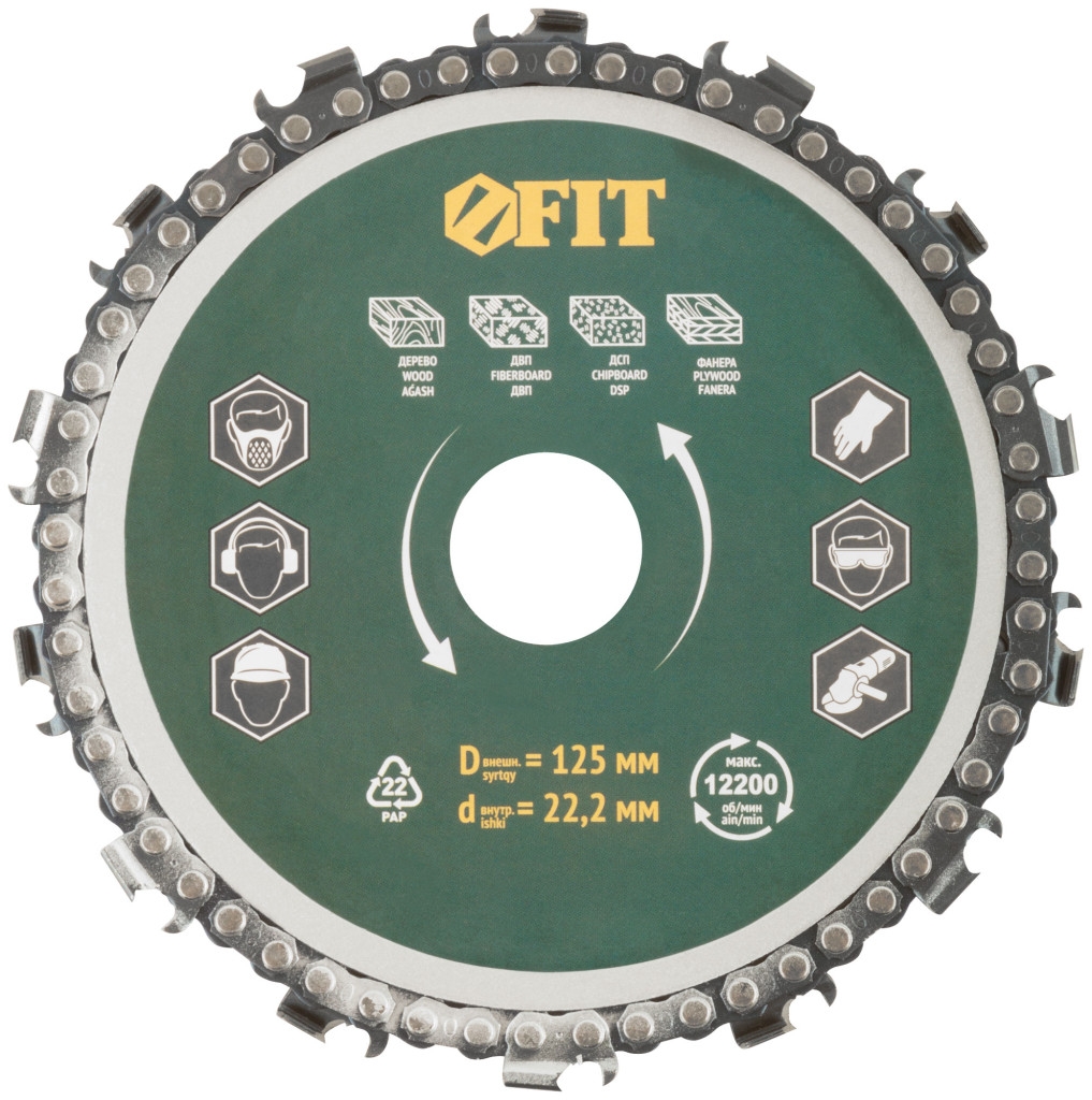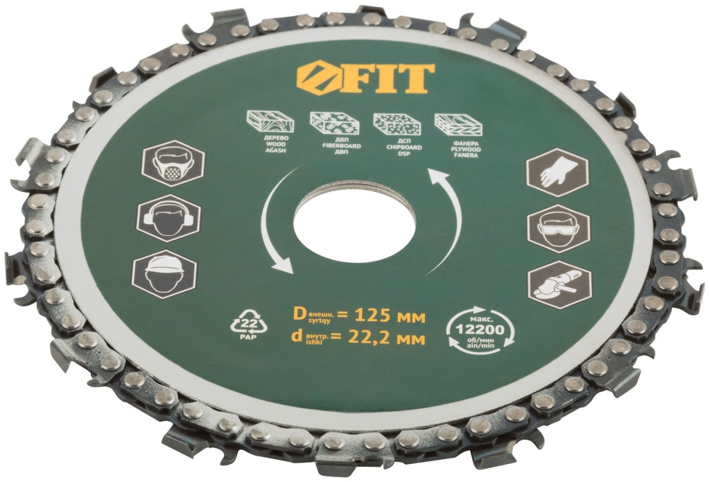 Диск отрезной цепной по дереву, толщина реза 6 мм, посадочный диаметр 22,2 мм, 125 мм. Для резки, фрезерования, профилирования, рифления, нарезки и выборки пазов в дереве, фанере, ДВП и ДСП. Толщина реза 6 мм. Посадочный диаметр 22,2 мм. Предназначен для углошлифовальных машин.