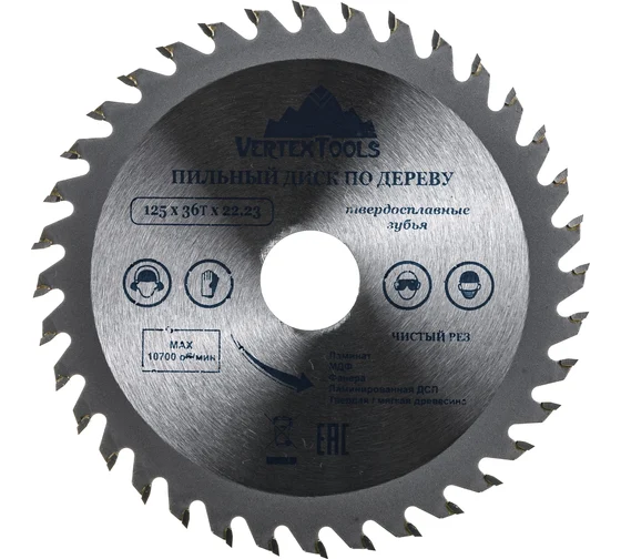 Пильный диск по дереву Vertextools 125-24-22 предназначен для выполнения точных продольных и поперечных чистовых пропилов в мягкой и твердой древесине, прессованной слоистой древесине, фанере, ламинате и ДСП.