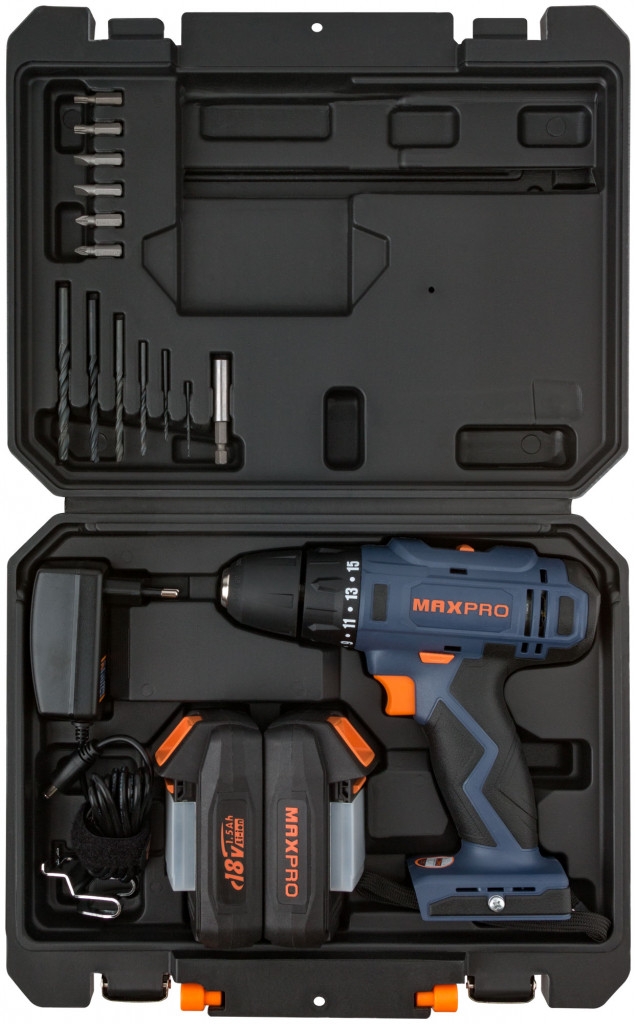 Дрель-Шуруповерт акк.18,0 В; 0-350/1250 об/мин, регулир.об., резин.вст.MAX-PRO