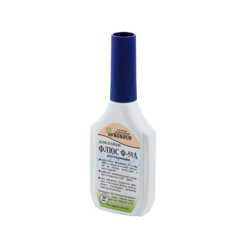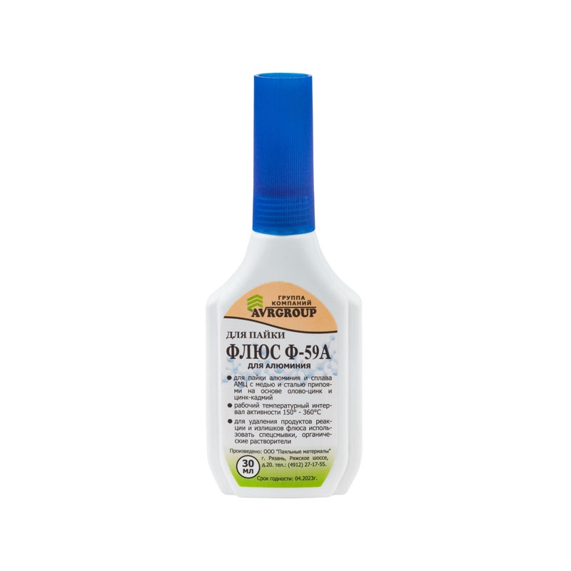 Флюс Ф-59А активный флюс для пайки алюминия, А010165, 30 мл. применяется для пайки алюминия и сплава АМЦ с медью и сталью припоями на основе олово-цинк и цинк-кадмий при t = 150 - 320° C. Удобный флакон с капельницей.