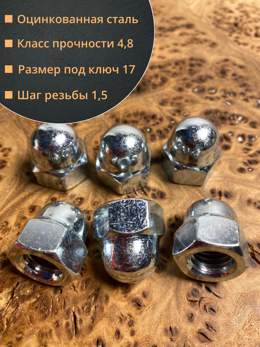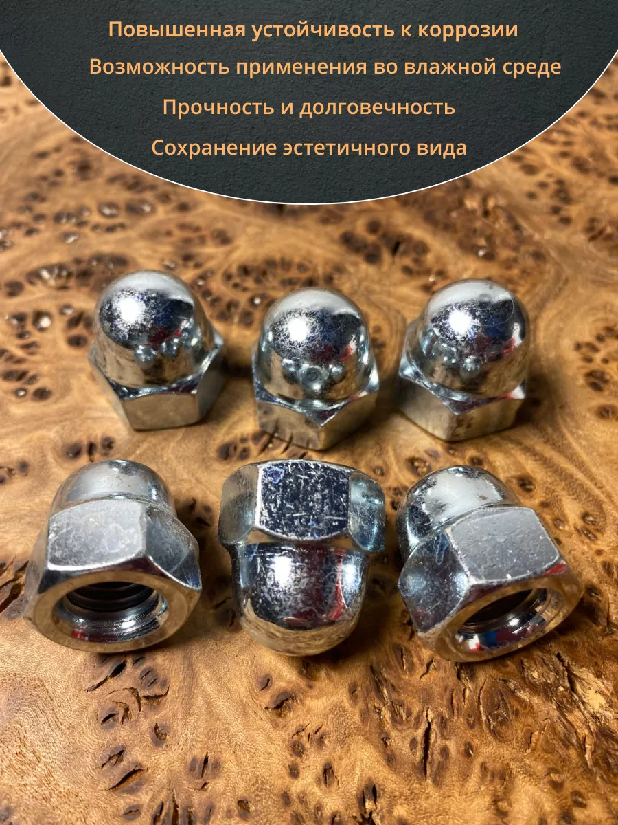 Колпачковая гайка представляет собой сочетание обычной шестигранной гайки и сферического колпачка и предусматривает 2 конструкции – сферические и более плоские. Они различаются между собой глубиной колпачка. Они применяются везде, где требуется красивое и надежное резьбовое соединение. Гайки производятся из углеродистой стали ( с покрытием и без), нержавейки, латуни, алюминия. Стандартом DIN 1587 допускается обработка поверхности гаек для создания защитного никелевого или цинкового слоя.