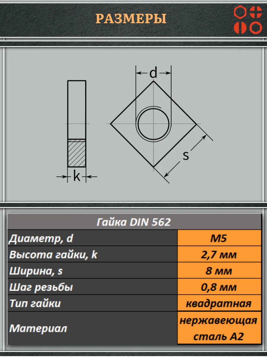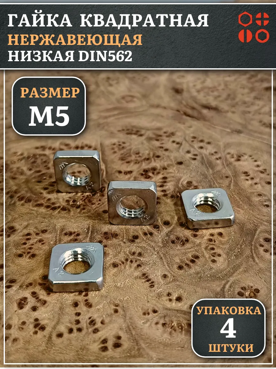 Гайка квадратная М5 нержавеющая низкая DIN562, 4 шт.