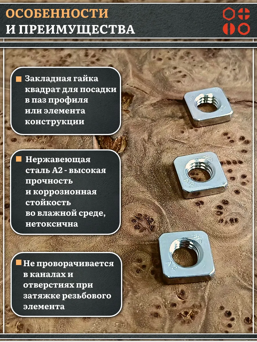 Квадратная гайка М5 DIN 562 из нержавеющей стали А2 используется для создания прочных резьбовых соединений в пазовых узлах. Её заранее помещают в специально подготовленный паз, чтобы предотвратить её проворот при вкручивании болта, винта или шпильки.