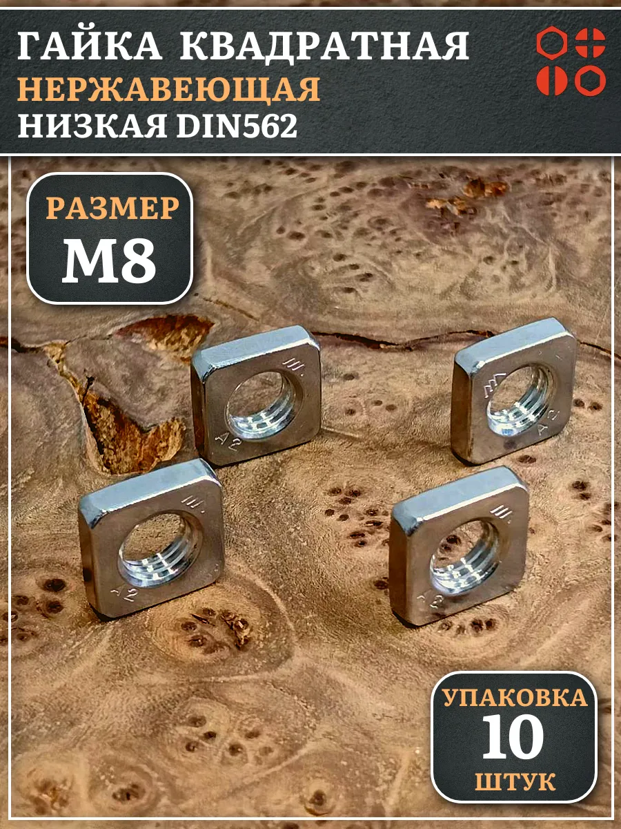 Гайка квадратная М8 нержавеющая низкая DIN562, 10 шт.