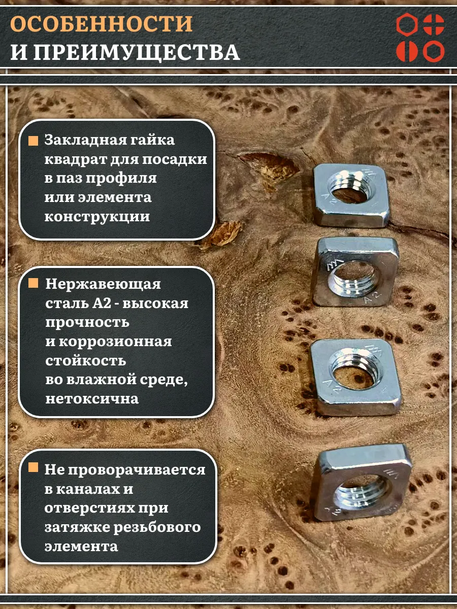 | Гайка квадратная М8 нержавеющая низкая DIN562, 10 шт. | 2000000260983ф10 | 1 шт. |