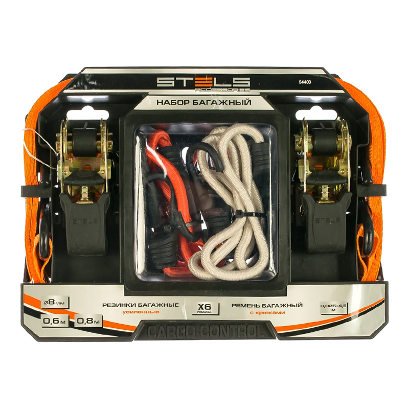 Набор стяжек и резинок для фиксации грузов Stels используется для фиксации грузов и будет полезен в автопутешествии. В комплекте ремни с храповыми механизмами, а также резинки разной длины с крюками. Разрывная нагрузка ремней составляет 680 кг, а эластичных стяжек — 50 кг, поэтому они надежно фиксируют предметы различных габаритов, предотвращая их смещение во время перевозки.