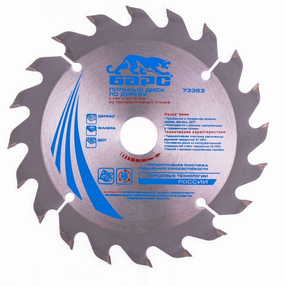 Пильный диск Барс 73353, ф140 х 20 мм, с 20 зубьями и кольцом 20/16 мм предназначен для быстрого пиления древесины мягких и твердых пород, ДСП, МДФ и фанеры. Тип зубьев АТВ и оптимально подобранный угол зуба позволяют производить как продольный, так и поперечный распил. Диск используется совместно с торцовочными и циркулярными пилами с посадкой 20 мм. В комплект входит переходное кольцо на диаметр 16 мм, расширяющее возможности применения оснастки. Диск подходит для интенсивной эксплуатации и может использоваться в профессиональной сфере. Повышенная износостойкость - пластины изготовлены из сплава YG8 твердостью свыше 88 HRА с добавлением легирующих компонентов, формирующих мелкозернистую структуру материала.