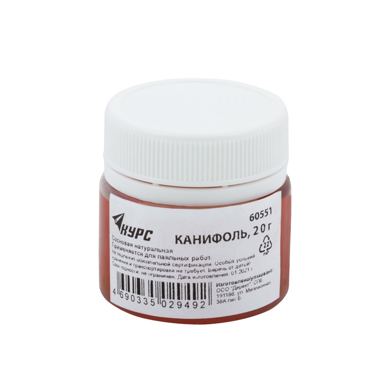 Канифоль сосновая, баночка, 20гр. применяется для пайки радиодеталей и ответственных узлов РЭА в промышленности и быту. Не вызывает коррозии и разрушения радиоэлементов, оставляет защитную пленку после применения, повышает прочность соединения, не образует вредных испарений при нагревании.