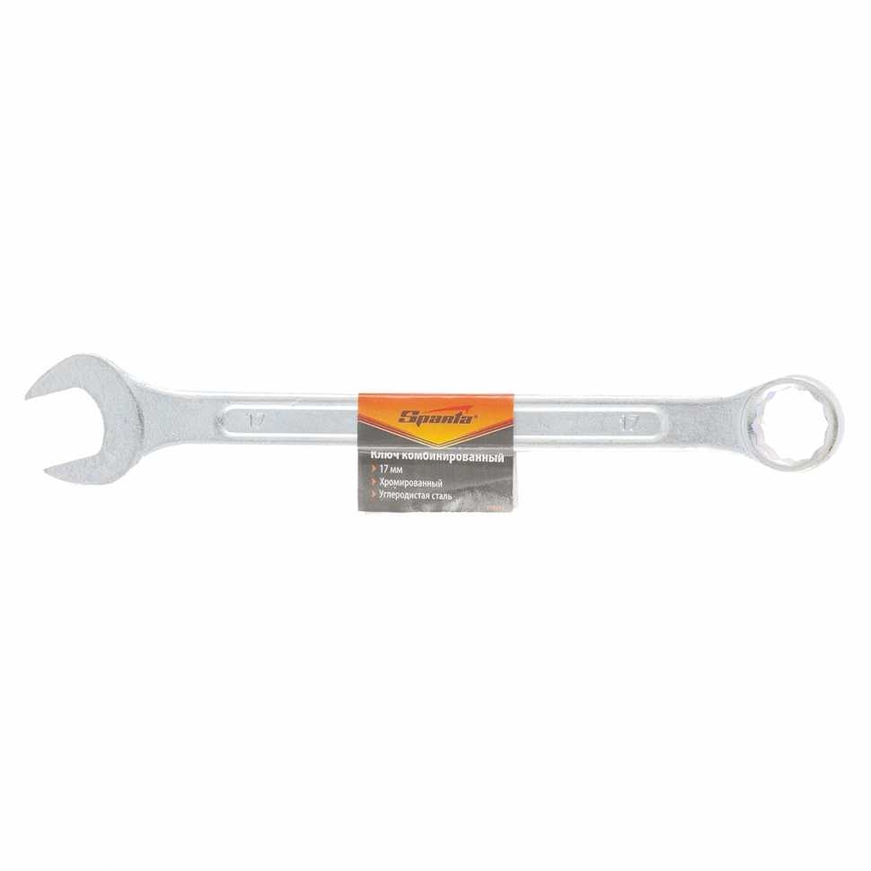 Комбинированный ключ Sparta 150445, 17 мм, хромированный — слесарно-монтажный инструмент для работы с резьбовыми соединениями. 12-гранная накидная головка обеспечивает надежный контакт с поверхностью крепежа, а рожковый зев дает возможность работать там, где применение кольцевого затруднено. Ключ пригодится в мастерской, гараже, будет полезен во время строительства и ремонта. Ключ изготовлен из углеродистой стали марки 45, чем обеспечивается его прочность и хороший ресурс.