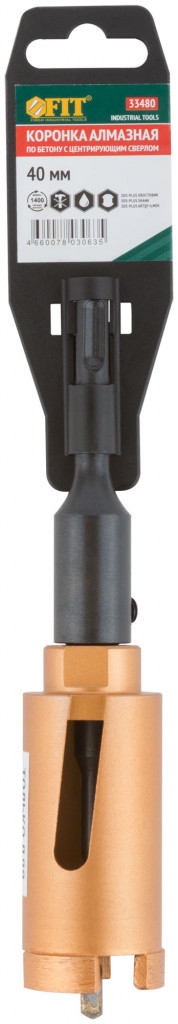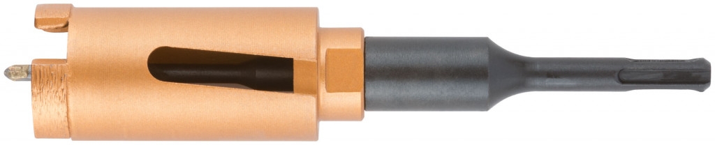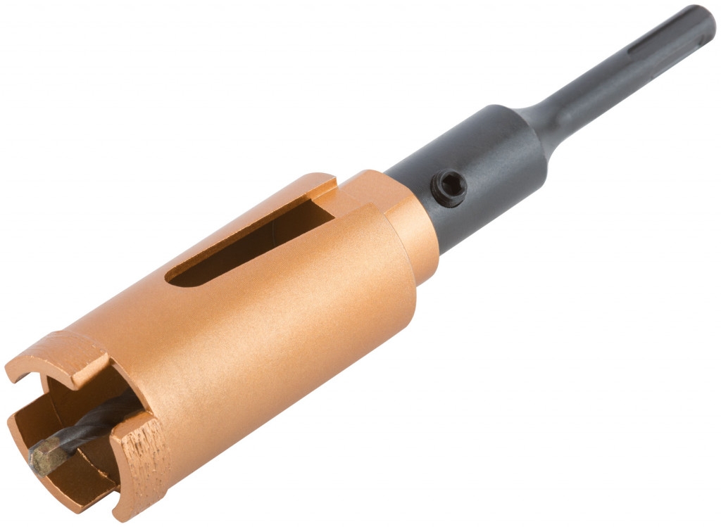 Коронка алмазная с центрирующим сверлом и хвостовиком SDS-PLUS. Для безударного сверления отверстий под монтажные коробки в бетоне и кирпиче. Для работы с водяным охлаждением. Материал: корпус из инструментальной стали, хвостовик и центрирующее сверло из легированной стали, режущая кромка содержит порошок из технических алмазов. Упаковка: пластиковый подвес.