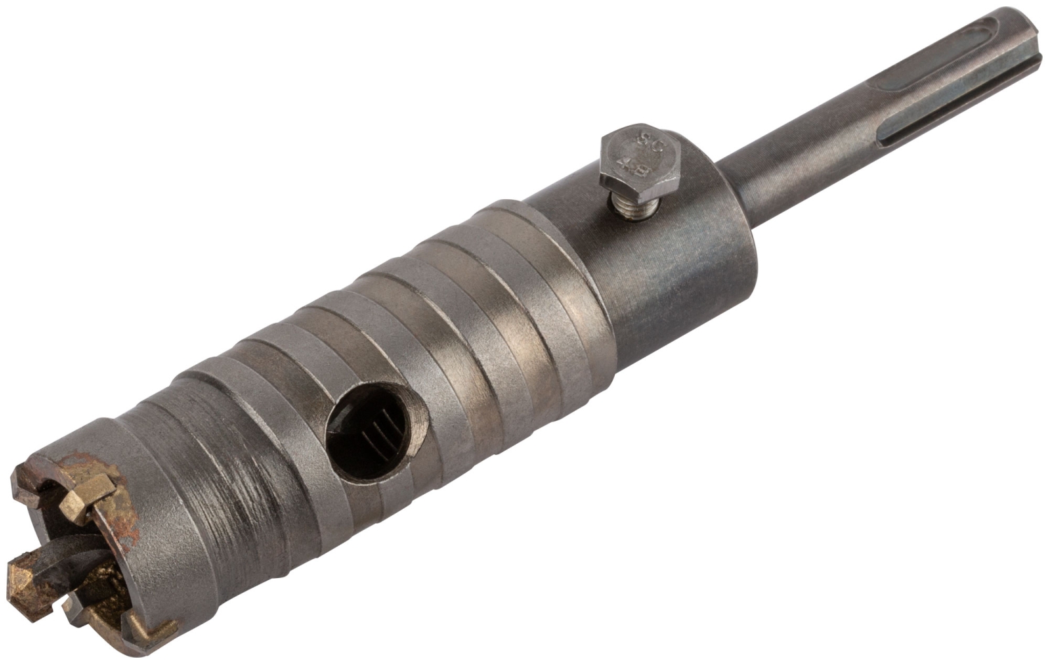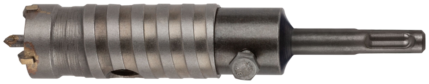 Хвостовик 110 мм. В сборе. Для перфоратора. Для ударного сверления отверстий в бетонных, кирпичных и каменных стенах. Материал: хвостовик и центрирующее сверло легированная инструментальная сталь с добавлением хрома; корпус инструментальная сталь; твердосплавные резцы из карбида вольфрама. Упаковка: пластиковый подвес.