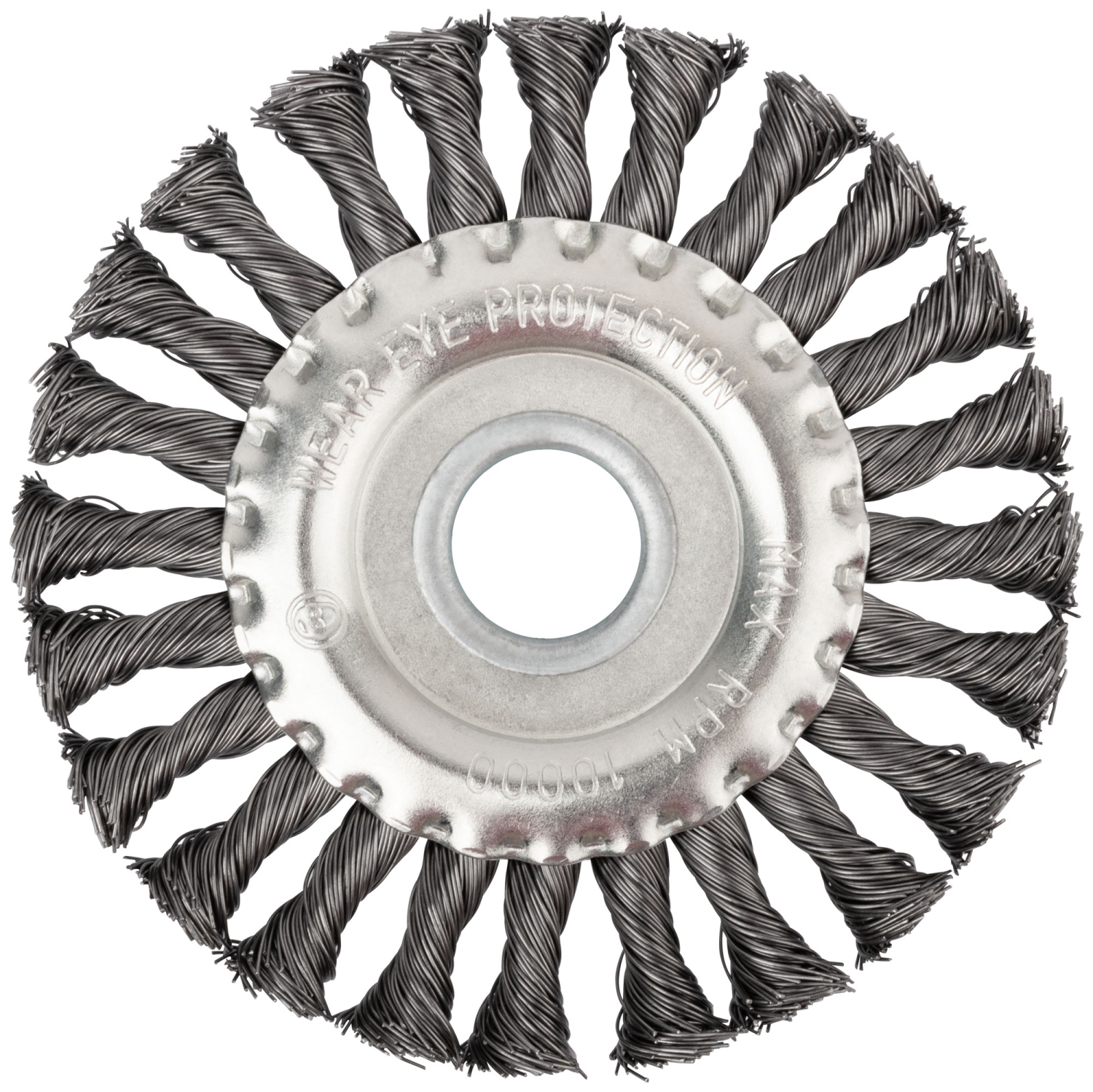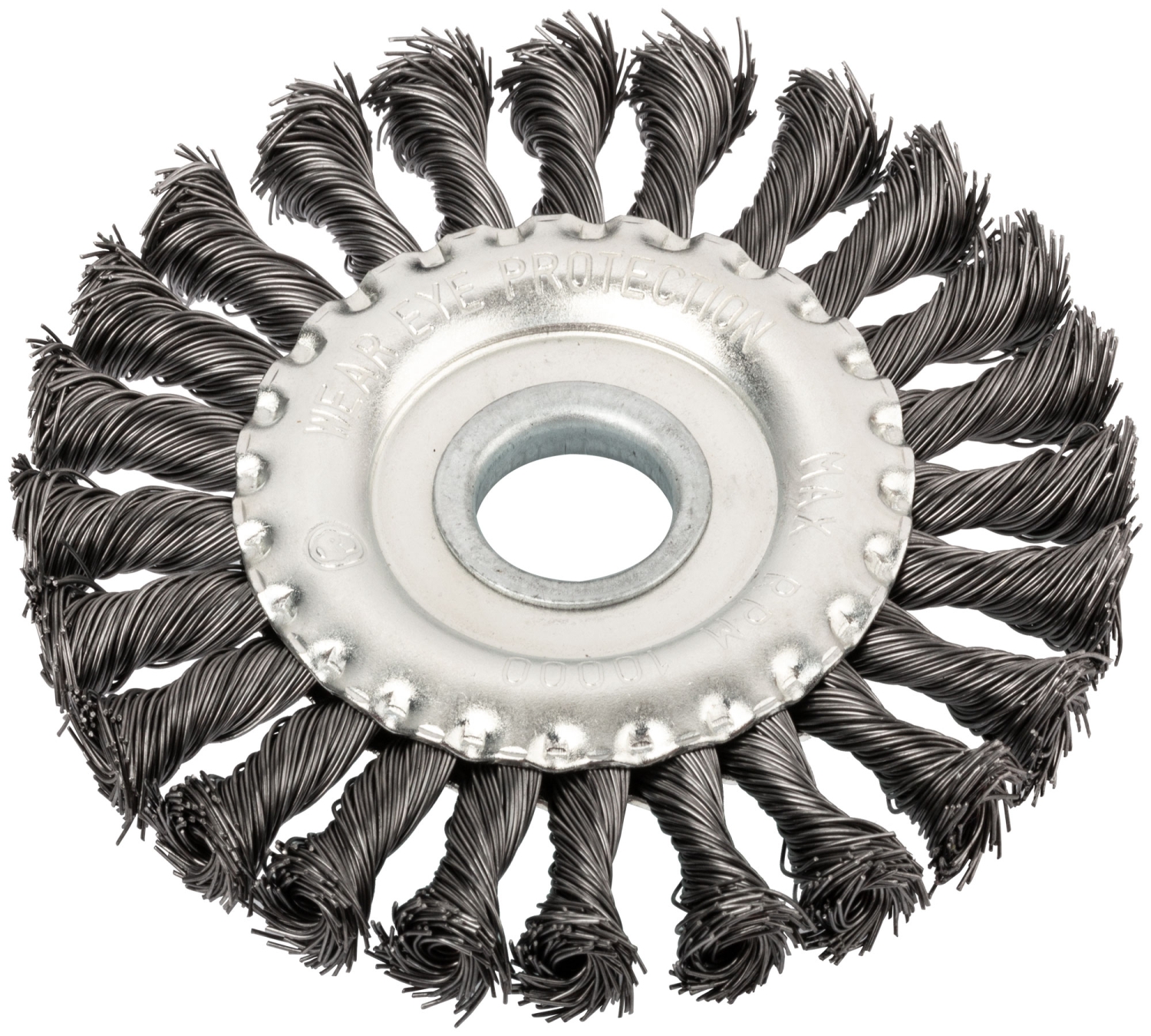 Тип «колесо». Для УШМ. Витая стальная проволока. Посадочный диаметр – 22,2 мм. Упаковка: картонная коробка.
