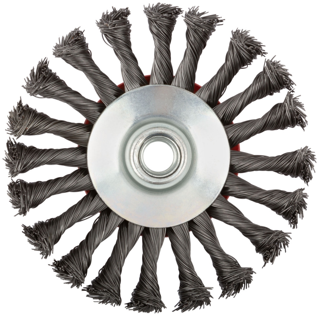Тип «колесо», с наклоном, гайка М14. Для УШМ. Витая стальная проволока 125 мм. . Упаковка: картонная коробка.