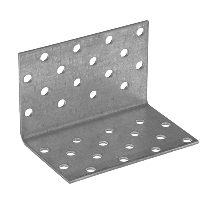 Равносторонний перфорированный уголок представляет собой стальную пластину, изогнутую под углом 90°, с отверстиями одинакового диаметра под многоточечный монтаж с помощью саморезов и гвоздей. Применяется в мебельном производстве, для соединения деревянных конструкций между собой и к основанию из дерева и металла, может использоваться для крепления балок, монтажа нагруженных несущих элементов из массивного бруса. Изготовлен из конструкционной стали с цинковым покрытием, обеспечивающим защиту от коррозии.