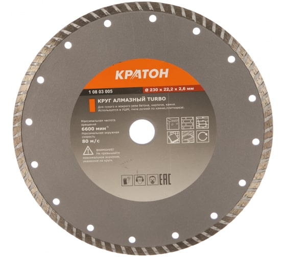 Круг алмазный TURBO HOBBY Кратон 1 08 02 005 предназначен для сухого и мокрого реза бетона, кирпича, камня. Имеет турбированную рабочую поверхность, что обеспечивает высокую производительность. Применяется он к шлифовальным машинам по камню, бетону, кирпичу. Изготовлена основа оснастки из высокопрочной закаленной стали, которая устойчива к температурным перепадам, обеспечивает длительный срок службы. Режущая часть имеет неравномерное распределение мелких алмазов. Благодаря алмазным гранулам повышена прочность насадки. Кромки среза материала аккуратные и ровные.