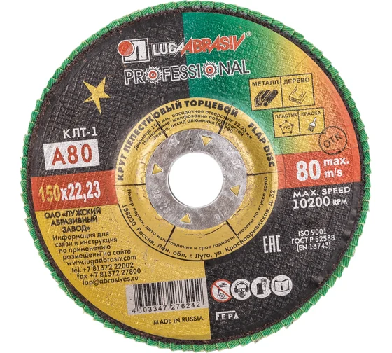 Круг лепестковый торцевой плоский КЛТ1 (150х22 мм; А 80; 14А 20/Р80) Луга D91015022140200 предназначен для ручных шлифовальных машин. Применяется для плоского шлифования, обработки кромок и сварных швов деталей и конструкций из различных марок сталей, цветных металлов и древесины. Круг работает тихо, устойчиво, без прижогов, оставляя холодными обработанные поверхности, обеспечивает максимальный съем материала.