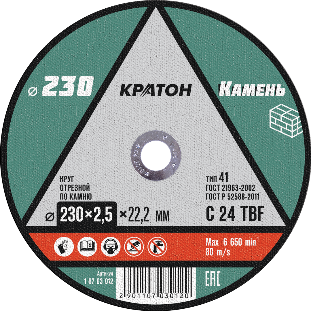 Круг отрезной C 24 TBF производства Кратон применяется с угловыми шлифовальными машинами имеющими посадочный шпиндель 22,2 мм. Диск рекомендуется использовать с рабочей скоростью до 80 м/с. Оснастка абразивного типа отлично зашлифовывает край разреза не оставляя сколов и заусениц. Диаметр диска составляет 23 см при высоте 2,5 мм. Этими параметрами определяется ширина и скорость разреза заготовки. Ультратвердые абразивы придают кругу прочность и сообщают ему высокую режущую способность.